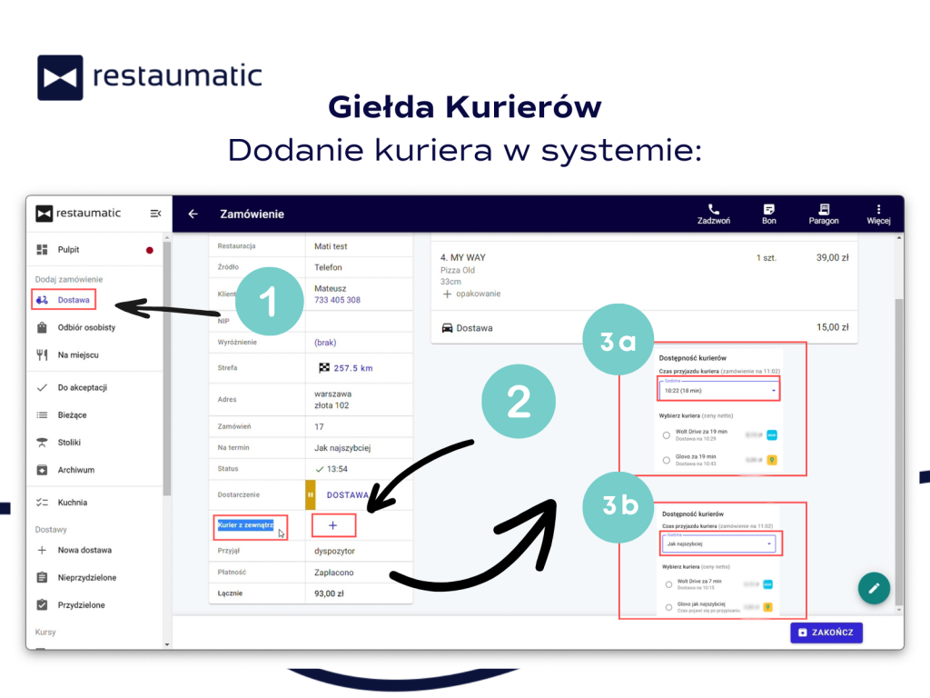Wystarczy kliknąć znak plus „+” (krok 2), aby wyświetlić informację na temat czasu odbioru kuriera. Odhaczając go i klikając przycisk „PRZYPISZ”, kierujemy kuriera do danego zamówienia. Możesz wybrać konkretny czas przyjazdu (krok 3a) lub opcję „Jak najszybciej” (krok 3b).