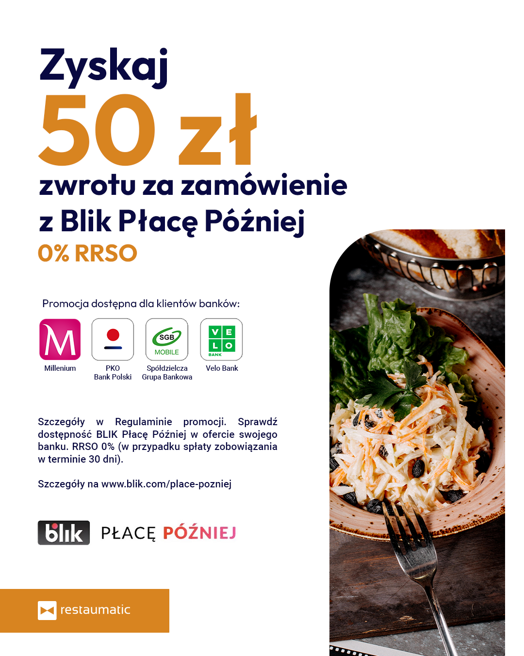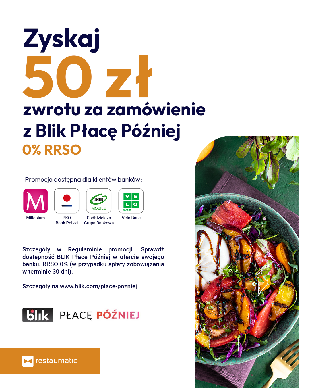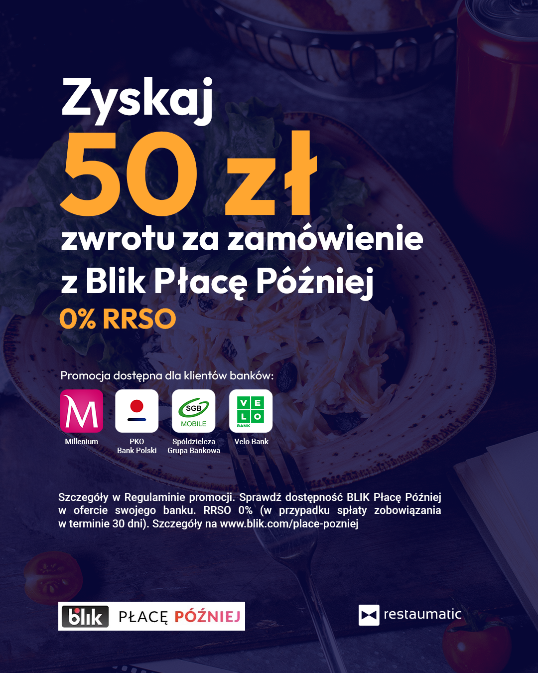 Zamów swoje ulubione dania za minimum 55 zł, wybierz płatność BLIK Płacę Później i ciesz się zniżką. To prostsze niż myślisz!