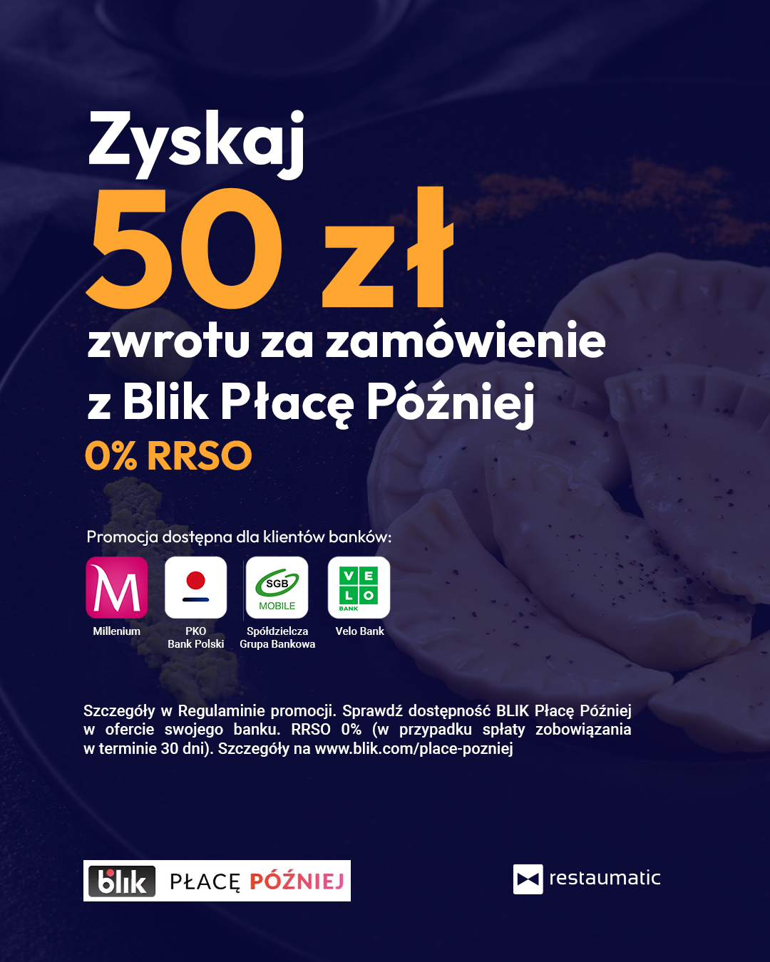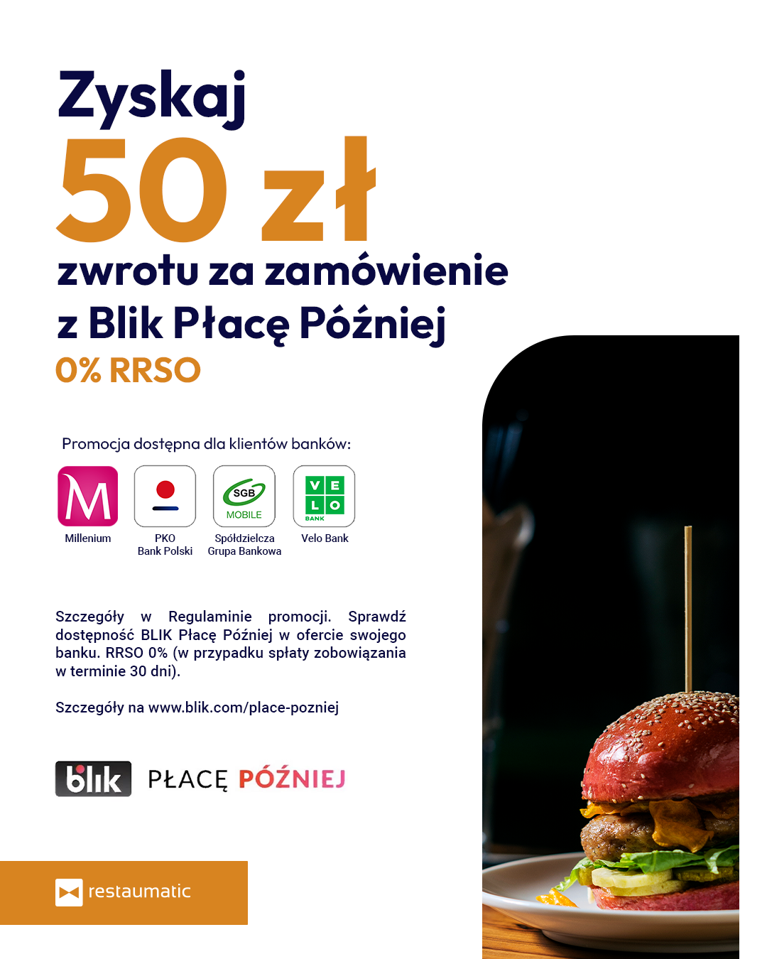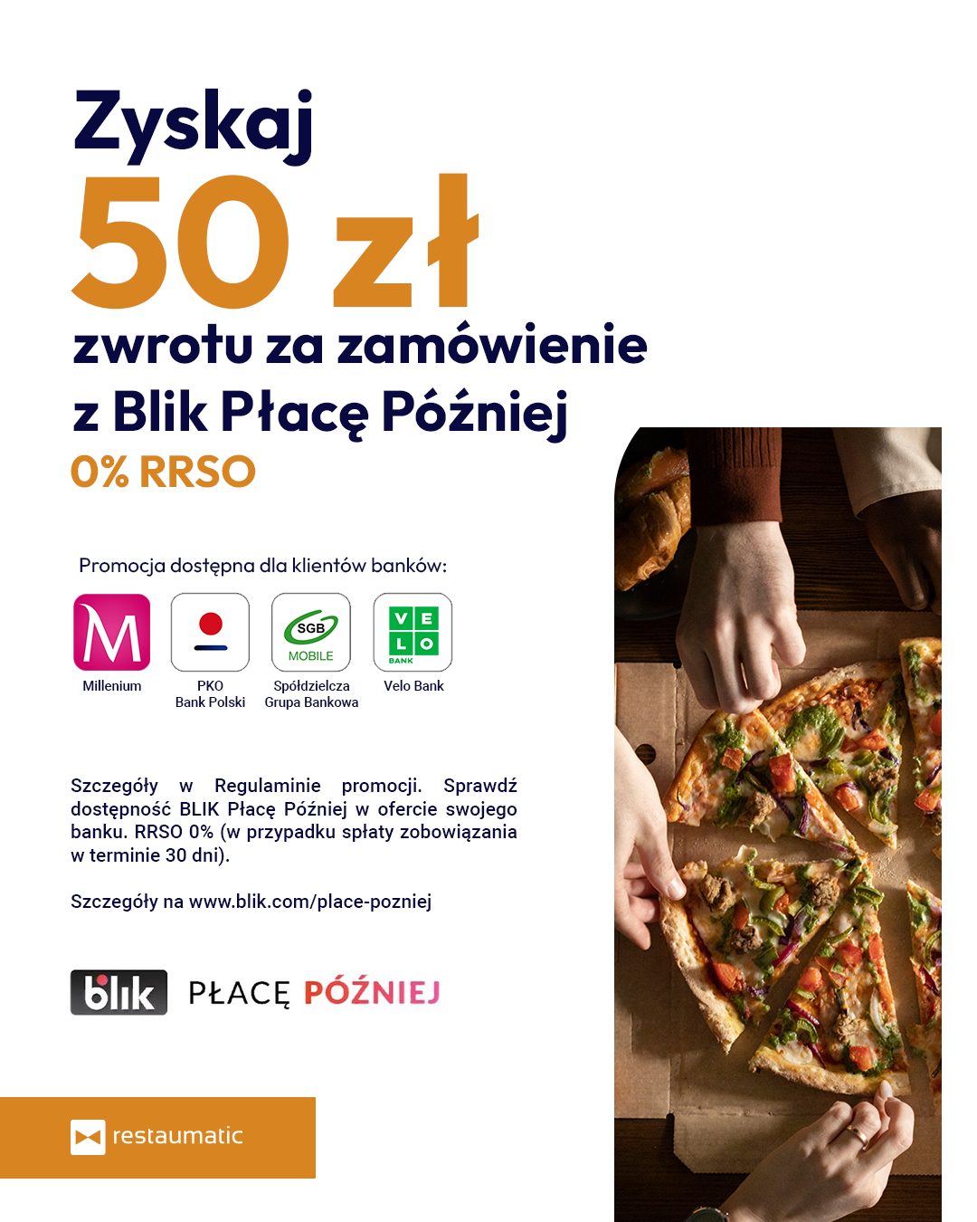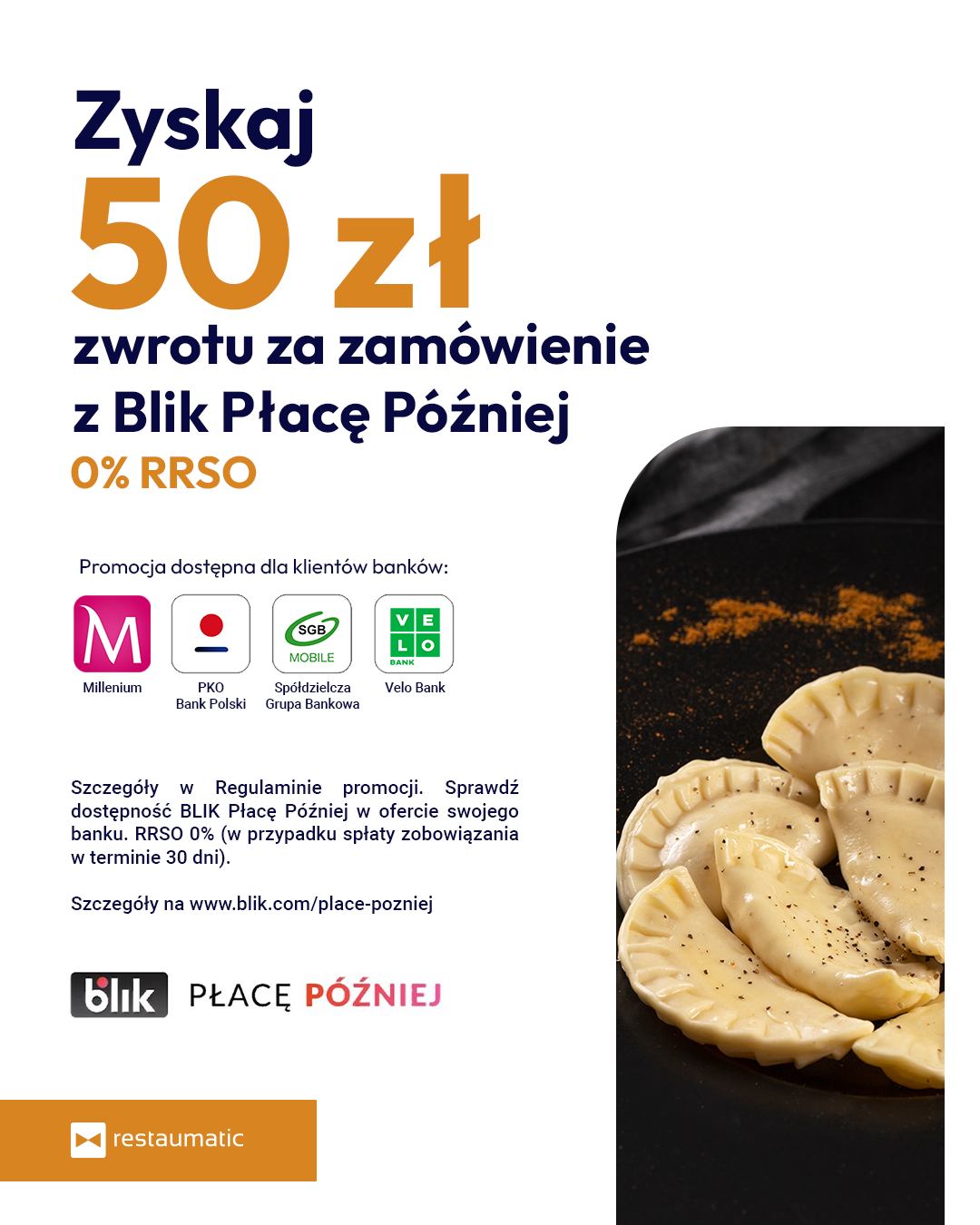 Zamów swoje ulubione dania za minimum 55 zł, wybierz płatność BLIK Płacę Później i ciesz się zniżką. To prostsze niż myślisz!
