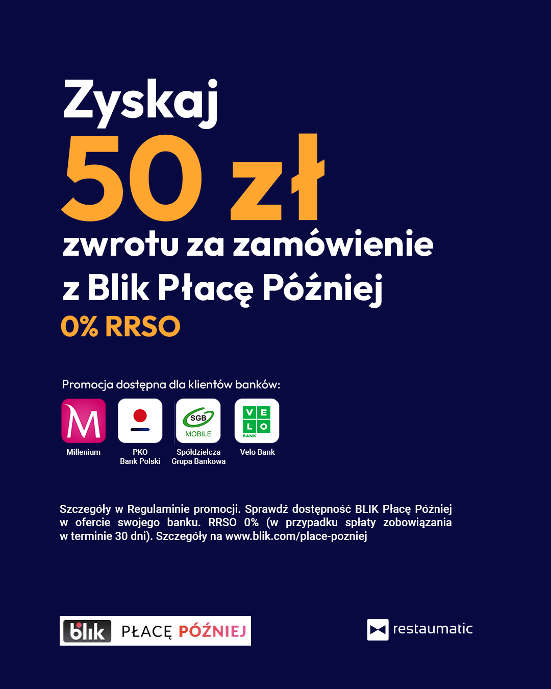 Blik przygotował dla restauracji współpracujących z Restaumatic wyjątkową promocję: 50 zł zwrotu za zamówienie za minimum 55 zł w terminie 15–31.12.2025, z banków partnerskich. Mamy dla Ciebie gotowe materiały na social media – skorzystaj z nich i zachęć klientów do składania zamówień!